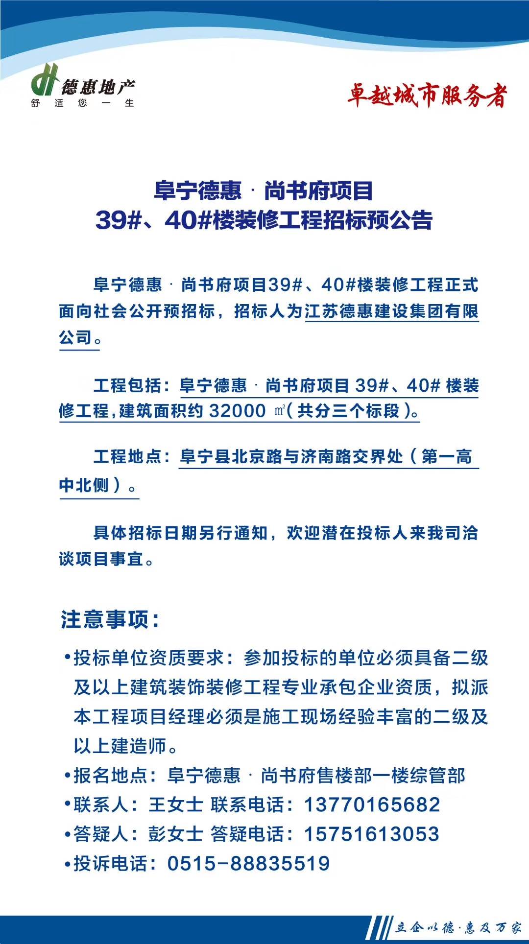 阜寧德惠·尚書府項(xiàng)目39#、40#樓裝修工程招標(biāo)預(yù)公告