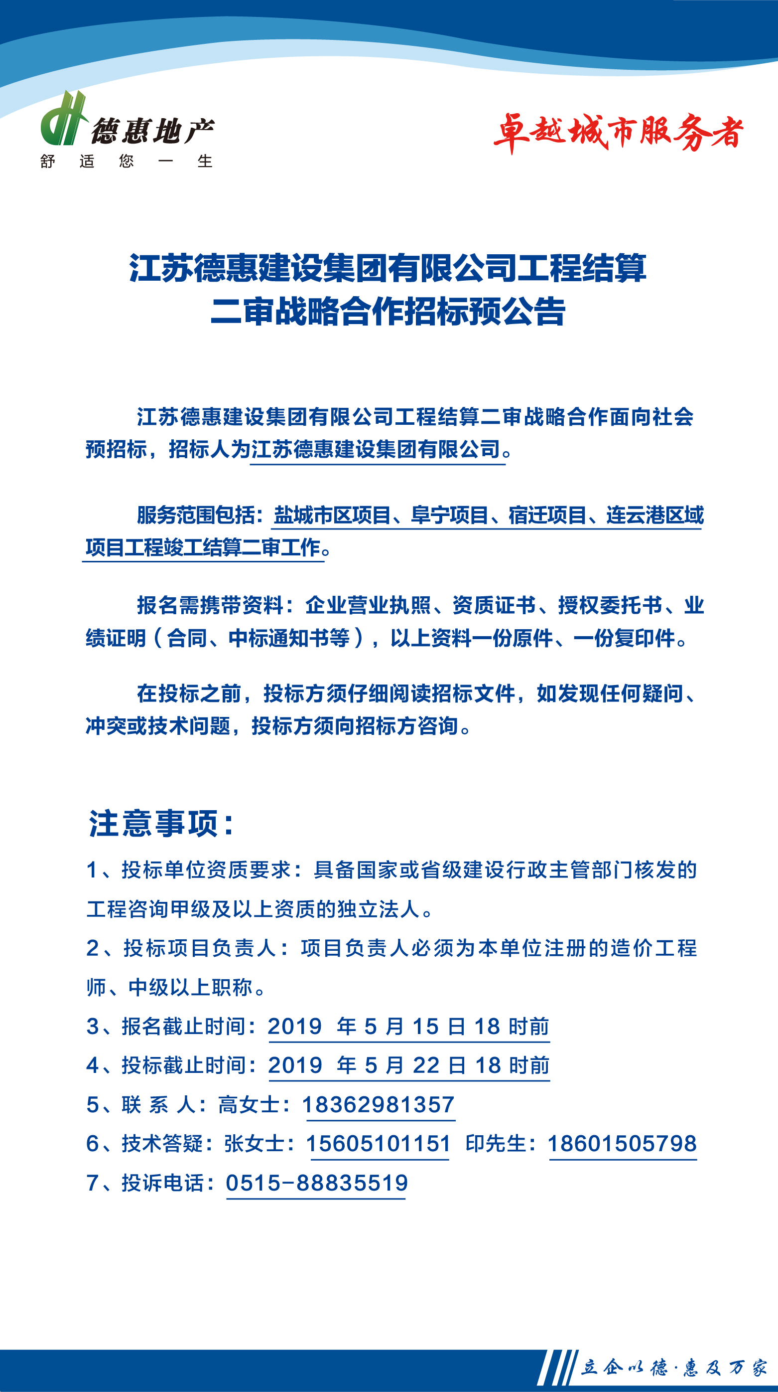 江蘇德惠建設(shè)集團(tuán)有限公司工程結(jié)算二審戰(zhàn)略合作招標(biāo)預(yù)公告