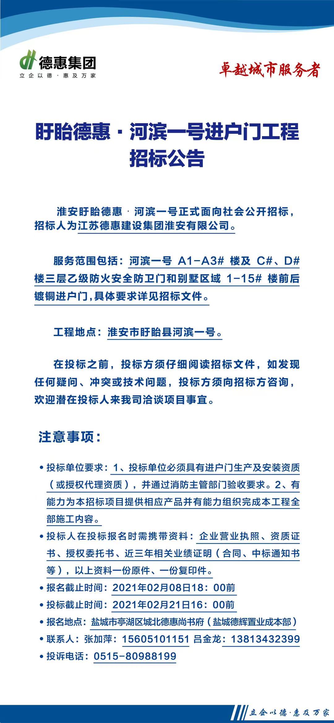 盱眙德惠·河濱一號進(jìn)戶門工程招標(biāo)公告