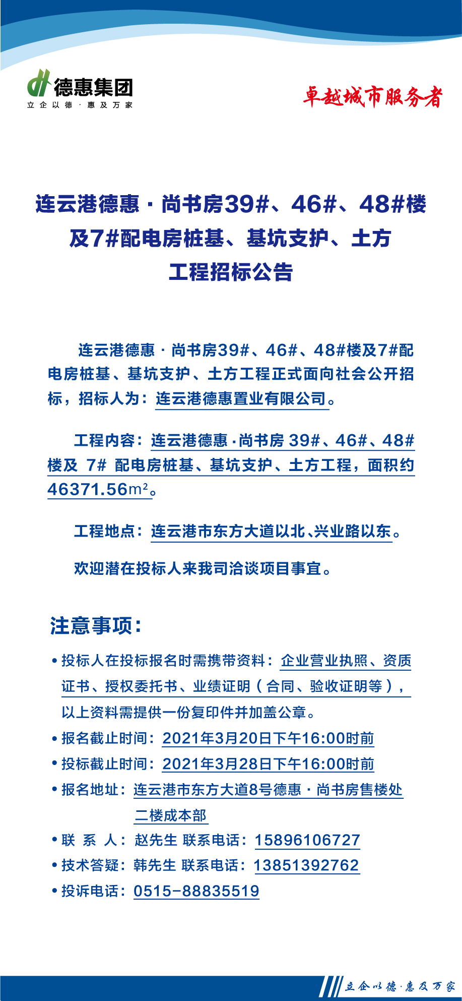 連云港德惠·尚書房39#、46#、48#樓及7#配電房樁基、基坑支護(hù)、土方工程招標(biāo)公告