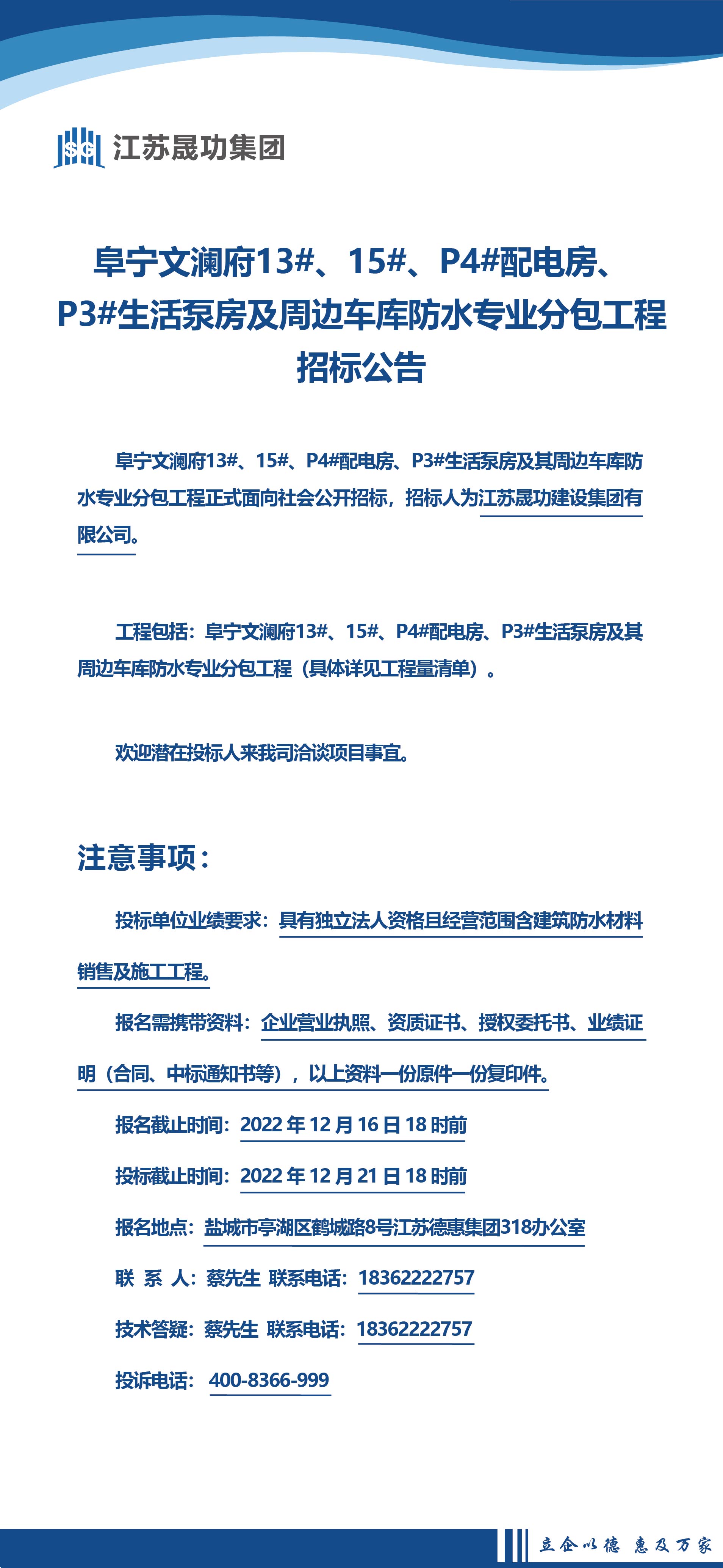 阜寧縣文瀾府二期13#、15#、P4#開閉所配電房、P3#生活泵房及其周邊車庫防水專業(yè)分包工程