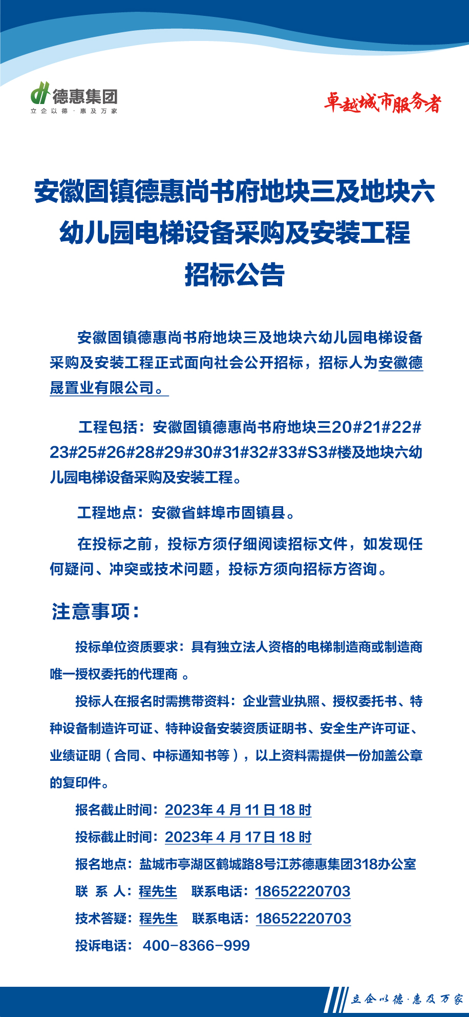 安徽固鎮(zhèn)德惠尚書府地塊三及地塊六幼兒園電梯設(shè)備采購及安裝工程