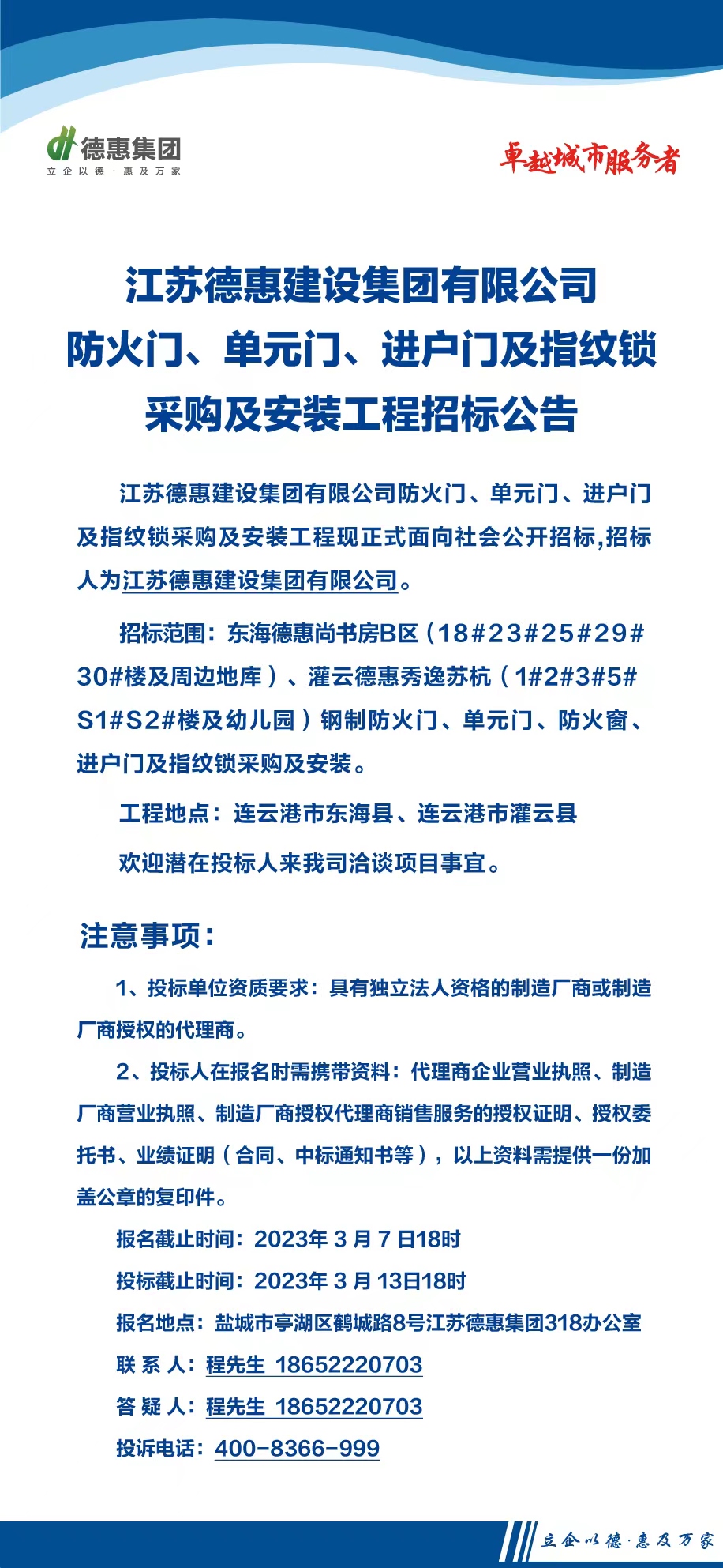 江蘇德惠建設(shè)集團(tuán)有限公司防火門、單元門、進(jìn)戶門及指紋鎖采購及安裝工程