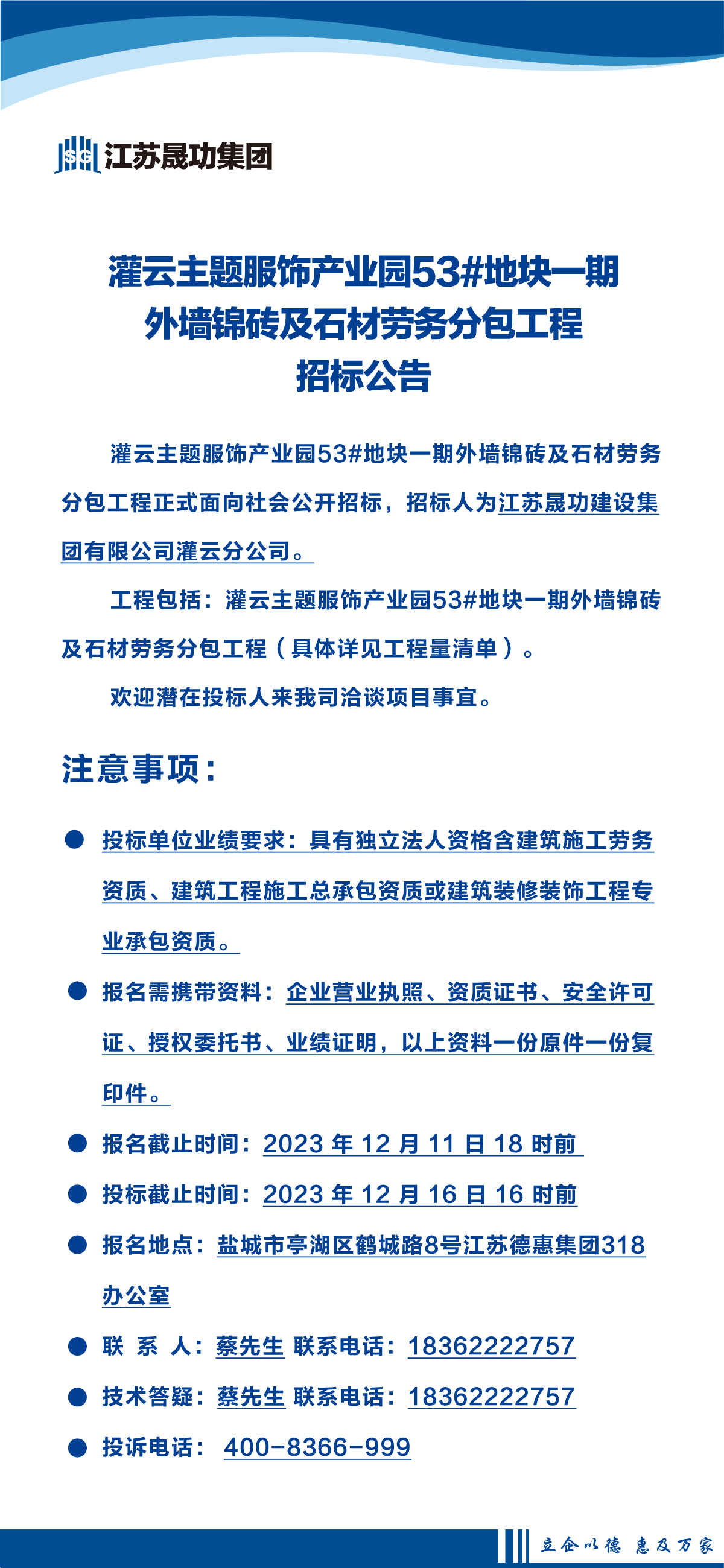 灌云主題服飾產(chǎn)業(yè)園53#地塊一期外墻錦磚及石材勞務(wù)分包工程