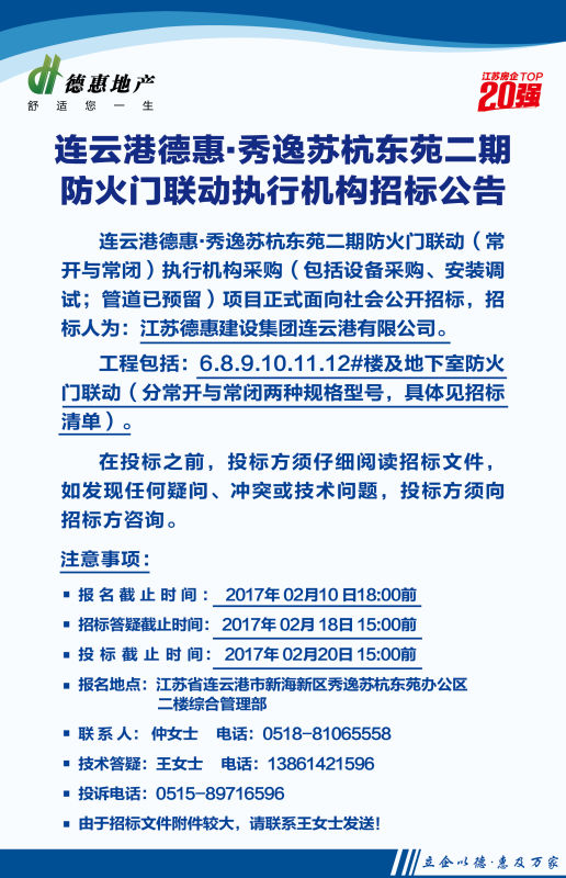連云港秀逸蘇杭東苑二期防火門聯(lián)動執(zhí)行機構(gòu)招標(biāo)公告及文件