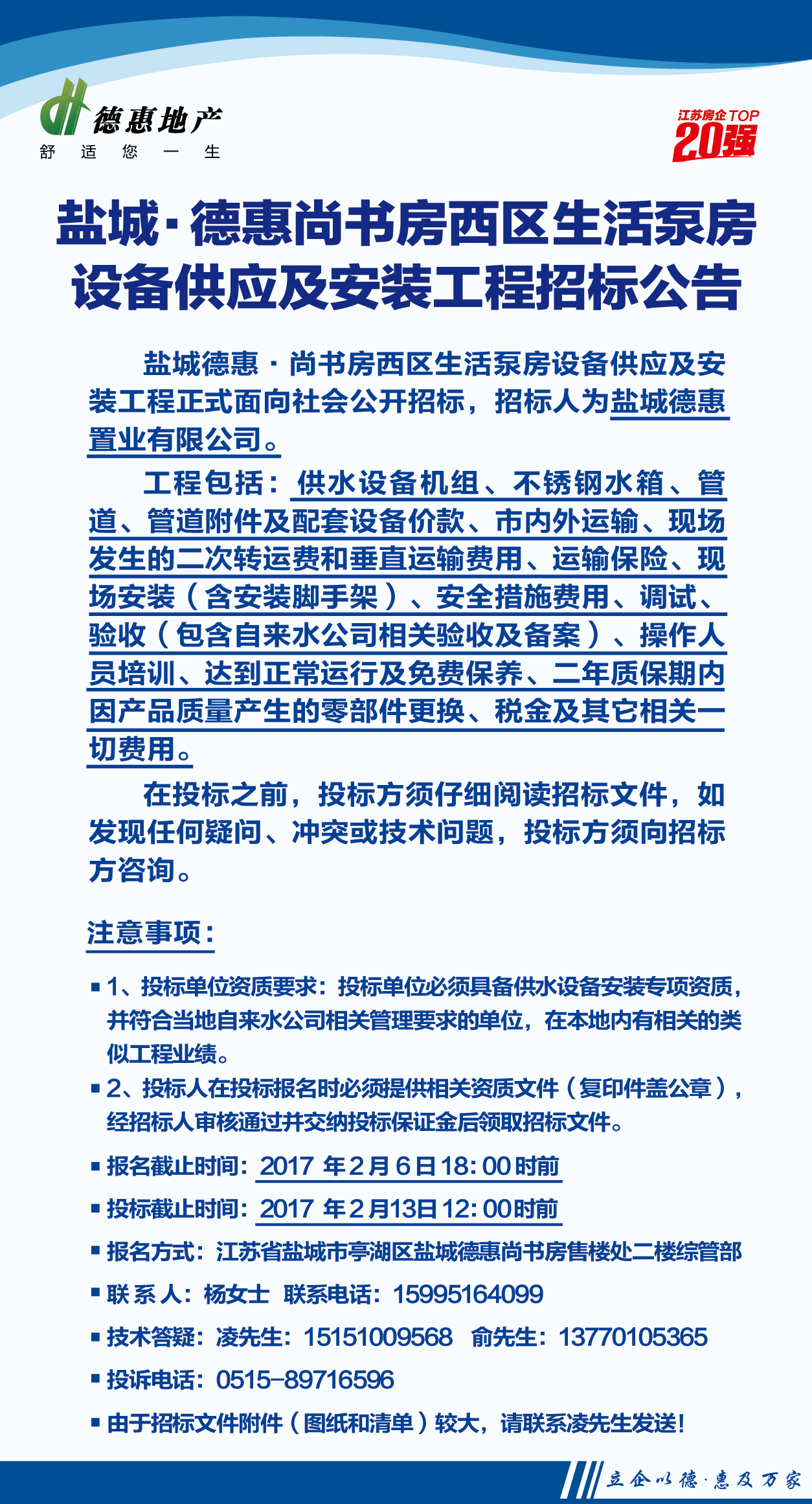 鹽城德惠尚書房生活泵房設(shè)備安裝工程招標(biāo)公告及文件