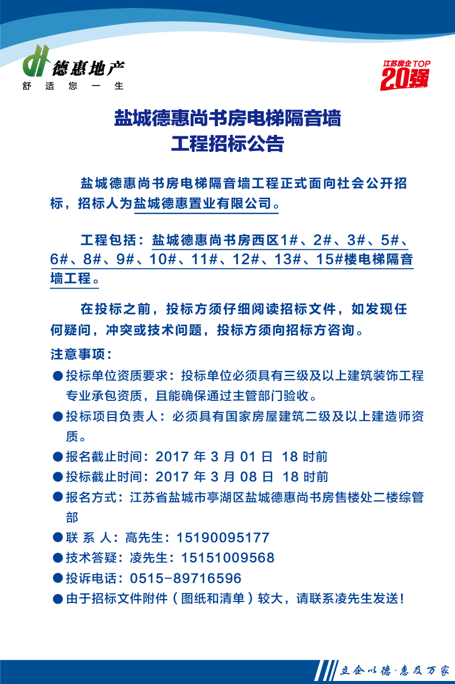 鹽城德惠尚書房西區(qū)電梯隔音墻工程招標(biāo)公告