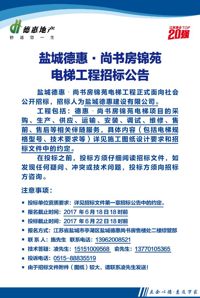 鹽城德惠•尚書房錦苑電梯工程招標公告