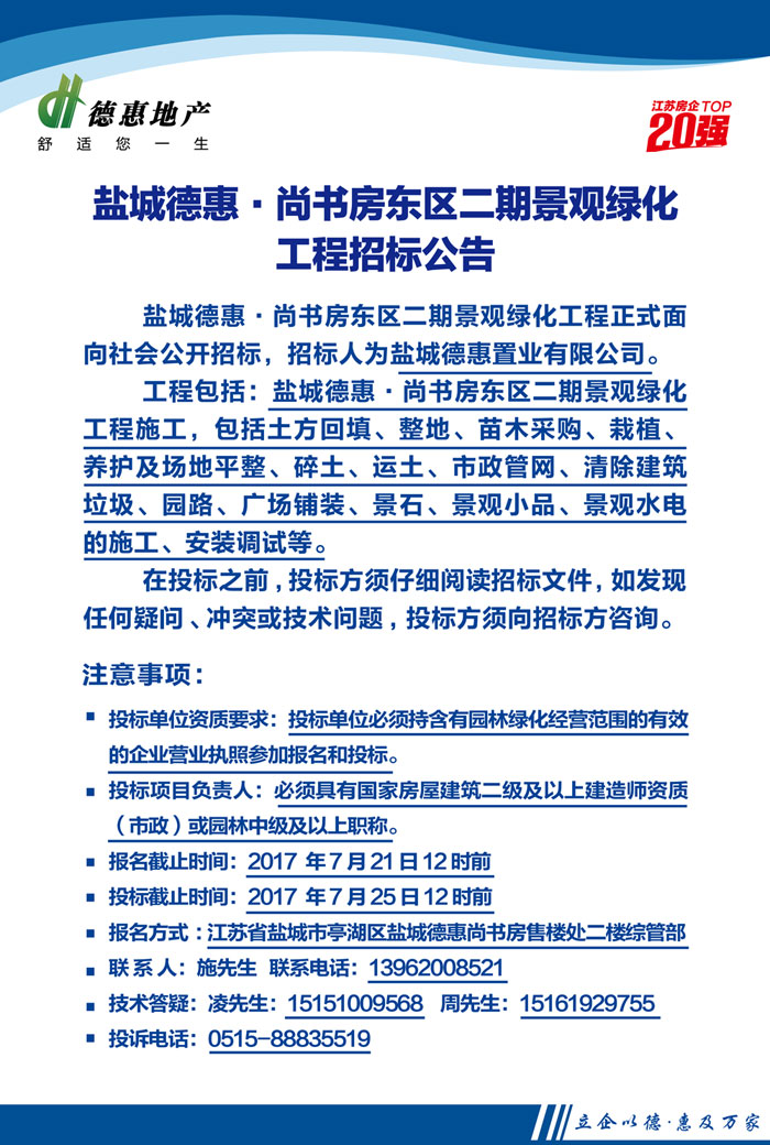 鹽城德惠·尚書(shū)房東區(qū)二期景觀綠化工程招標(biāo)公告