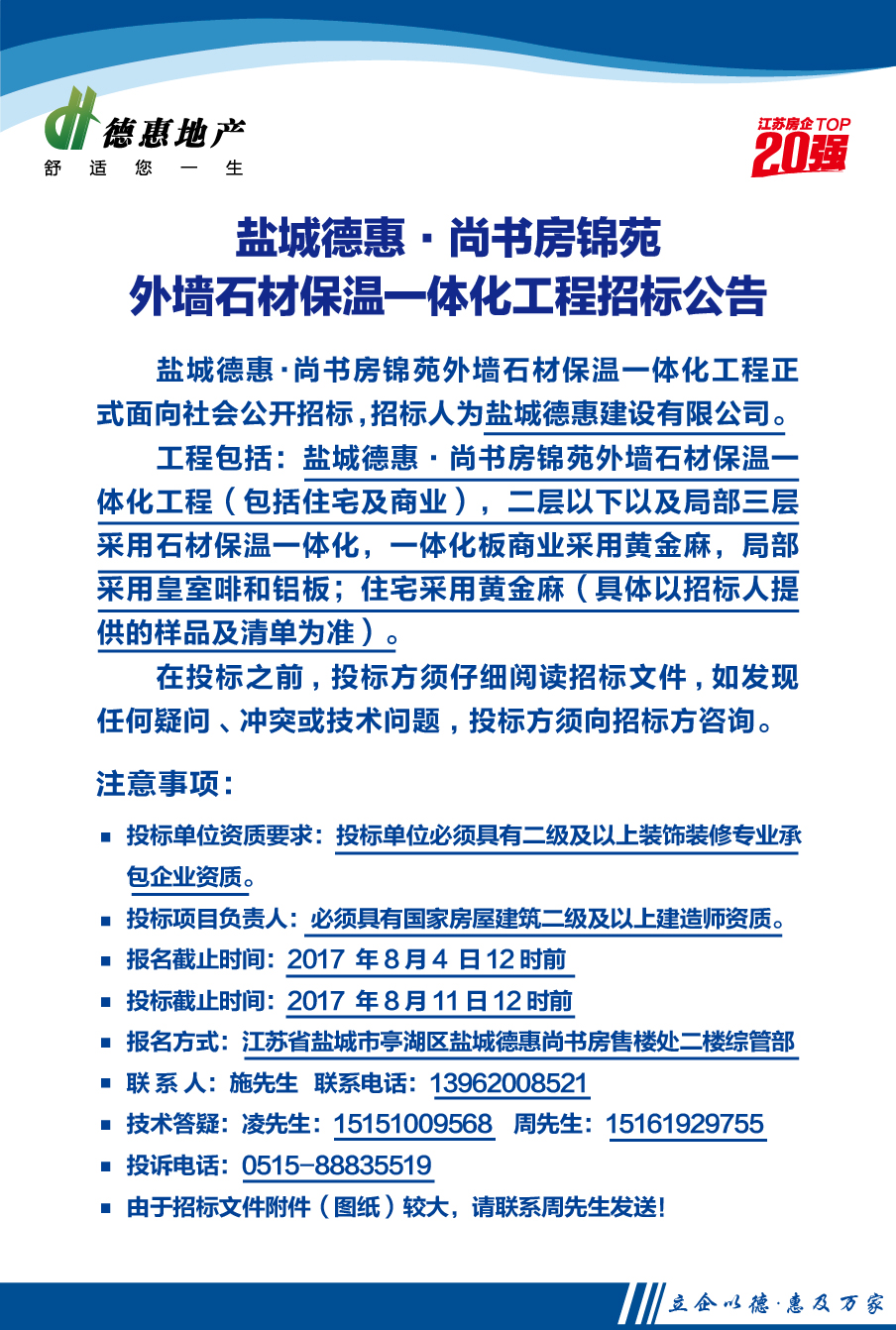 鹽城德惠•尚書房錦苑外墻石材保溫一體化工程招標(biāo)公告