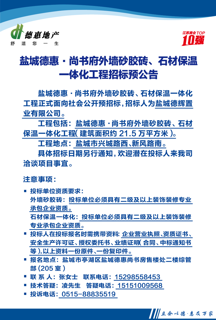 鹽城德惠·尚書府外墻砂膠磚、石材保溫一體化工程招標(biāo)預(yù)公告