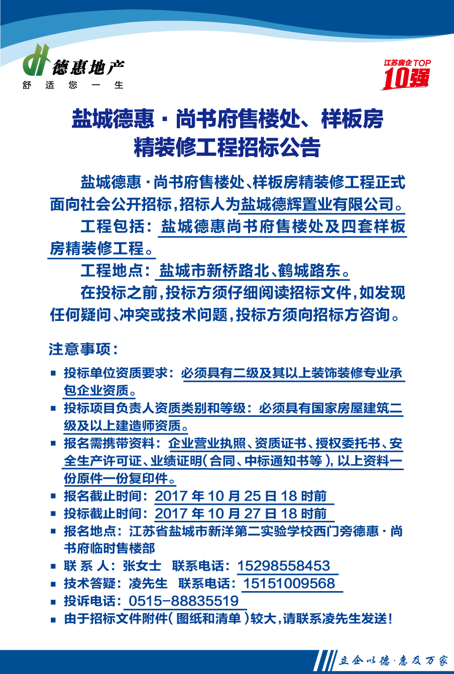 鹽城德惠·尚書府售樓處、樣板房精裝修工程招標公告