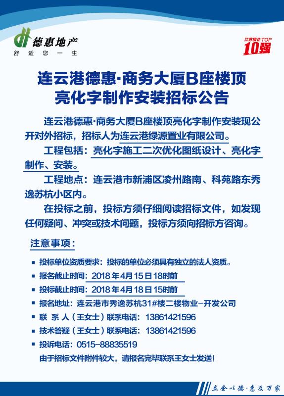 連云港德惠·商務大廈樓頂亮化字制作安裝招標公告