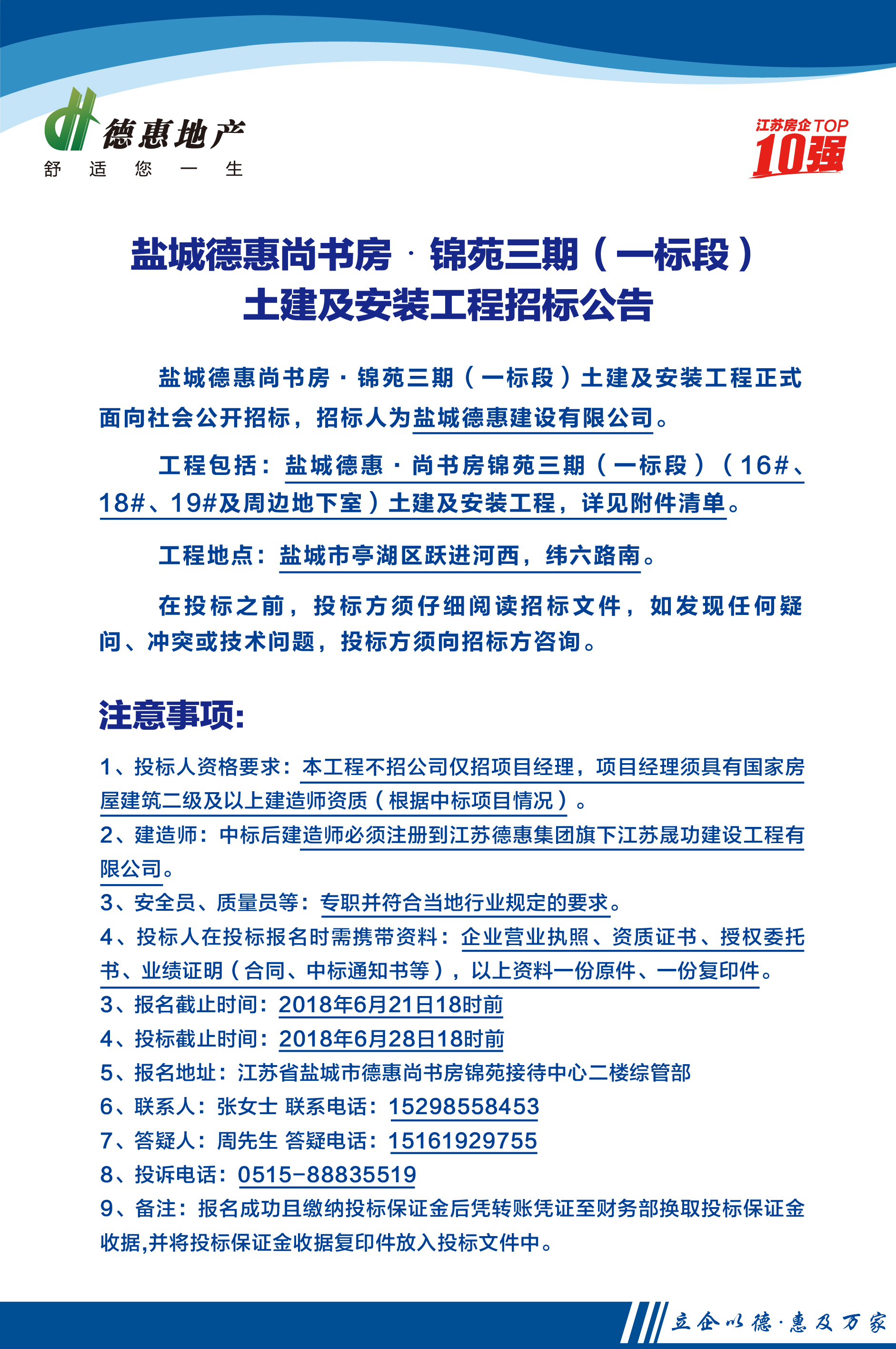 鹽城德惠·尚書房錦苑三期(一標(biāo)段)土建及安裝工程招標(biāo)公告
