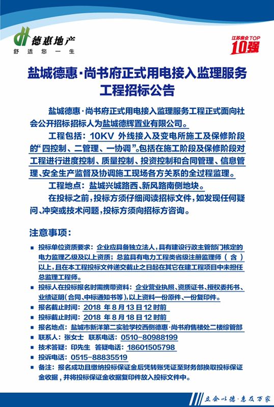 鹽城德惠·尚書府正式用電接入監(jiān)理服務(wù)工程招標(biāo)公告