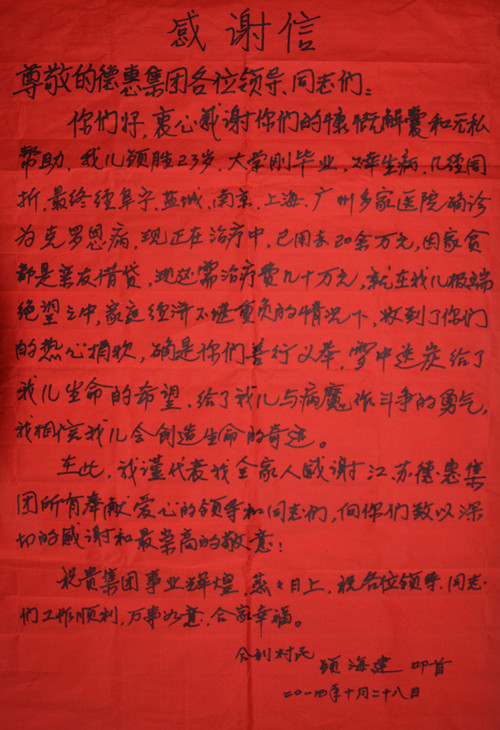 2014年10月30日下午,顧勝的父母將一面寫有“愛心捐資品德高尚,恩重如山永世不忘”的錦旗和一封數(shù)百字的感謝信送到了江蘇德惠集團(tuán),言辭之中流露出他們對德惠集團(tuán)全體員工捐資幫助兒子顧勝的感激之情。 顧勝,24歲,阜寧縣吳灘街道人,今年6月份畢業(yè)于南京工業(yè)職業(yè)技術(shù)學(xué)院工程造價(jià)專業(yè)。本來小伙子熱情積極,生活快樂。然而克羅恩病卻讓他痛不欲生,從今年年6月份開始醫(yī)院禁食,到目前為止,顧勝沒吃過任何東西,就靠一天四瓶腸道營養(yǎng)液來維持生命。 江蘇德惠集團(tuán)從2014年9月14日的新聞報(bào)道上看到了顧勝的不幸遭遇后,立即在集團(tuán)內(nèi)部倡議全員獻(xiàn)出一份愛心,幫助顧勝度過難關(guān),戰(zhàn)勝病魔。江蘇德惠集團(tuán)總部以及旗下的各子公司先后組織了愛心捐助活動,上至德惠集團(tuán)高層領(lǐng)導(dǎo),下至一線的基層員工,都紛紛伸出援助之手,為顧勝送來他們真誠的關(guān)心和祝福。10月15日,江蘇德惠集團(tuán)總部組織了愛心捐款儀式,各子公司派代表一一送上他們籌集的善款,朱文亮董事長個(gè)人捐款30000元,集團(tuán)旗下博藝公司朱文俊總經(jīng)理個(gè)人捐款10000元,集團(tuán)全員共籌集善款75164元。金額不分多少,心意不分大小,這些善款表達(dá)了江蘇德惠集團(tuán)每一位捐款人對顧勝的殷殷關(guān)切之心,希望他能早日戰(zhàn)勝病魔,早日康復(fù)。10月28日,德惠集團(tuán)工會程愛梅主席及辦公室張娟主任等一行代表德惠集團(tuán)走進(jìn)了顧勝的家中,為他送去了籌集的善款,以緩燃眉之急。 江蘇德惠集團(tuán)始終履行“回饋社會,熱心公益和社會慈善事業(yè)為己任”的使命,并用長期的實(shí)際行動號召:讓我們攜起手來,共同承擔(dān)扶貧濟(jì)困和發(fā)展慈善事業(yè)的社會責(zé)任,讓社會充滿愛! |