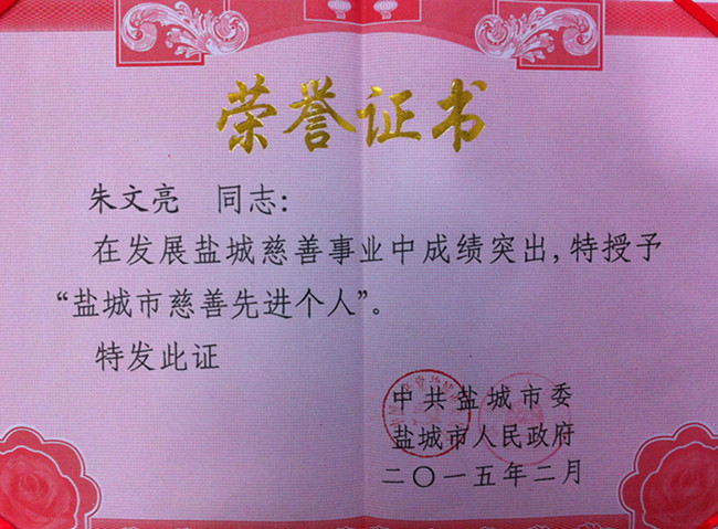 2015年2月13日,董事長朱文亮先生被授予“鹽城市慈善先進個人”榮譽稱號!