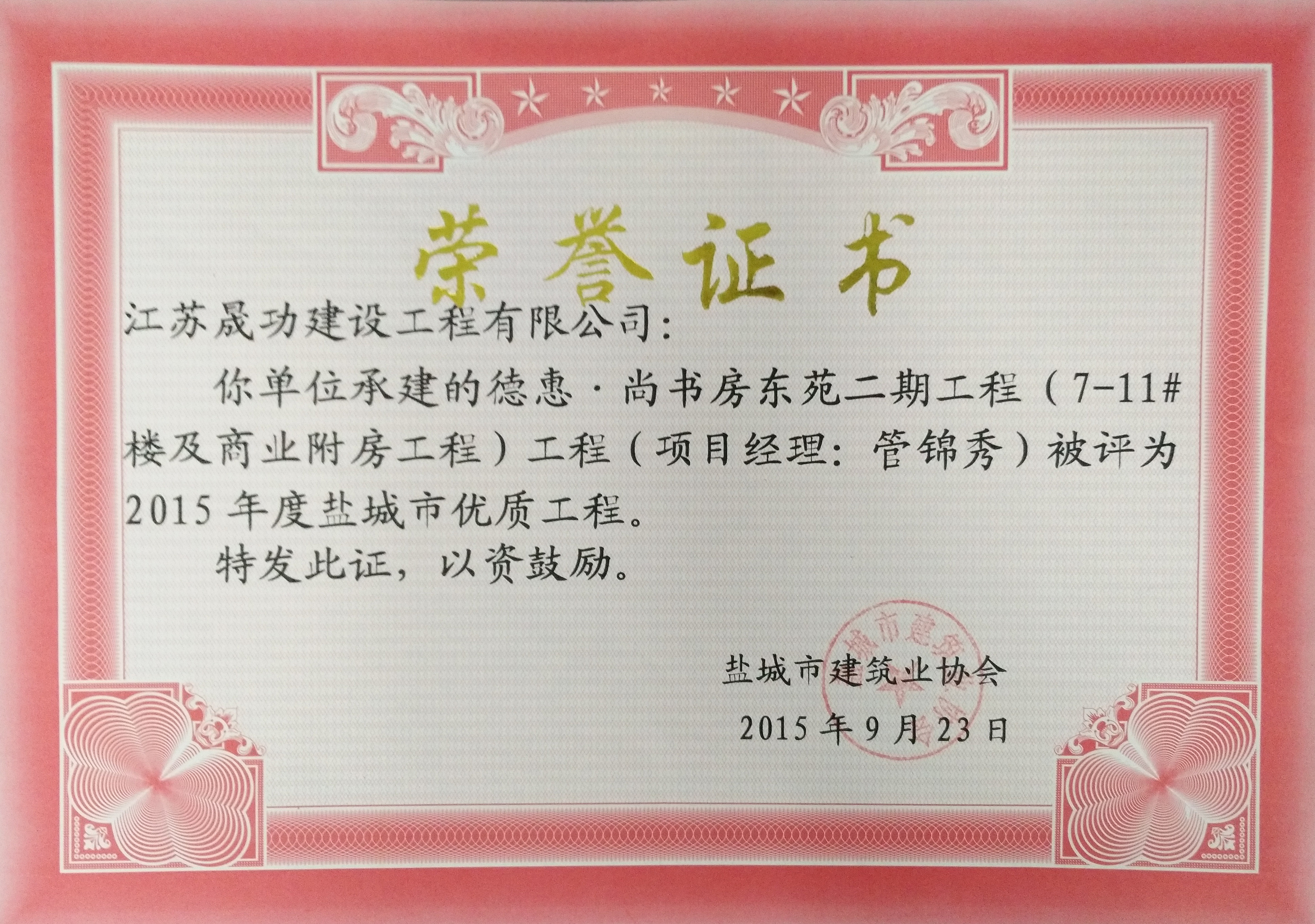 2015年10月16日,德惠·尚書房東苑二期工程(7-11#樓及商業(yè)附房工程)被評為2015年度鹽城市優(yōu)質工程!