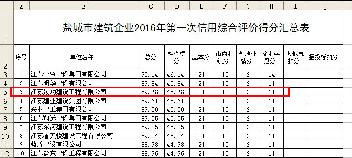 今年鹽城市城鄉(xiāng)建設(shè)局應(yīng)省建設(shè)廳要求對鹽城市內(nèi)已承接工程的建筑企業(yè)(房屋建筑施工總承包)進(jìn)行了2016年度第一次信用評價,現(xiàn)得分結(jié)果已經(jīng)公示,我集團(tuán)晟功建設(shè)以總分89.78分名列三甲。