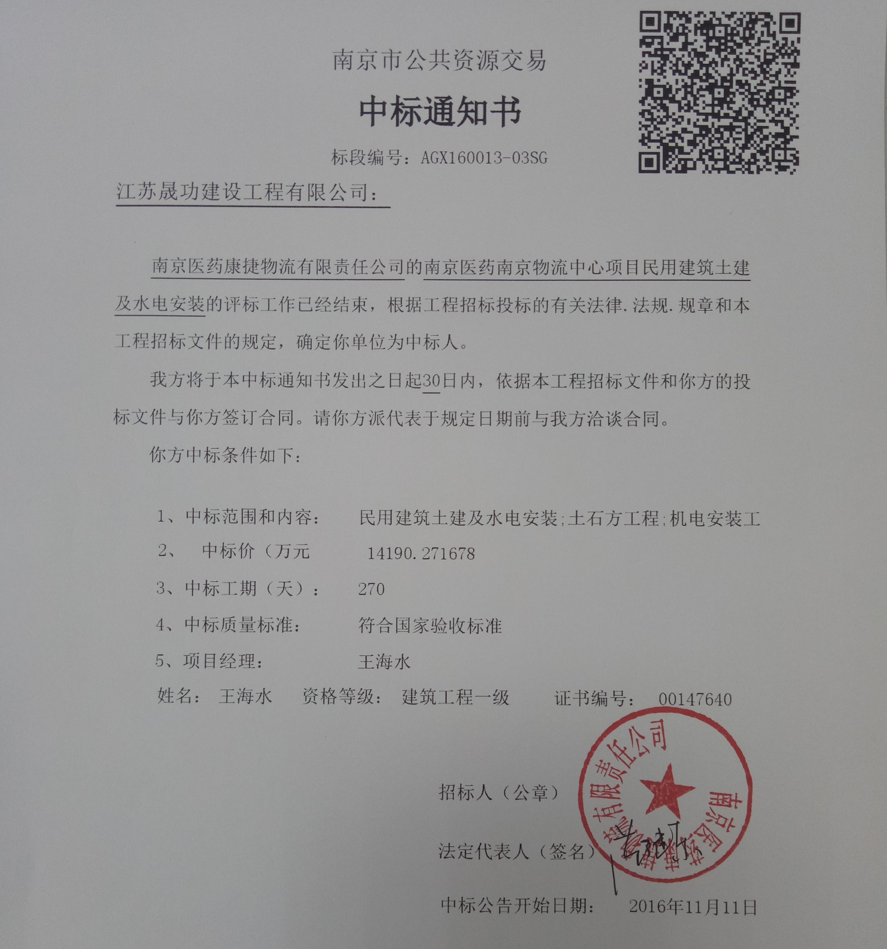 喜賀晟功建設(shè)中標(biāo)南京醫(yī)藥南京物流中心項(xiàng)目 |
