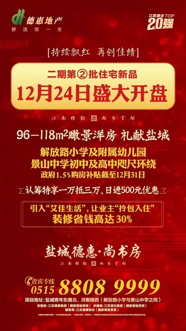 項目過硬的建筑品質(zhì)先后獲得省市各級政府部門的嘉獎。2016年2月,鹽城德惠尚書房項目榮獲鹽城市亭湖區(qū)人民政府頒發(fā)的建筑業(yè)工作“創(chuàng)省級標準化示范工地”獎項。2016年8月,德惠集團晟功建設(shè)與400多家強勁的對手企業(yè)激烈角逐評比后,位列鹽城市建筑企業(yè)信用評價前四強! 德惠集團全體人員未來將再接再厲,持續(xù)狠抓現(xiàn)場文明施工,以優(yōu)質(zhì)的質(zhì)量管理、先進的施工技術(shù)為保障,為鹽城父老鄉(xiāng)親打造更多精品之家。 新品開盤在即,火爆認籌中 為回饋家鄉(xiāng)父老的厚愛,鹽城德惠·尚書房二期第二批住宅新品將于 12月24日盛大開盤,現(xiàn)正火爆認籌中,誠邀父老鄉(xiāng)親蒞臨品鑒!