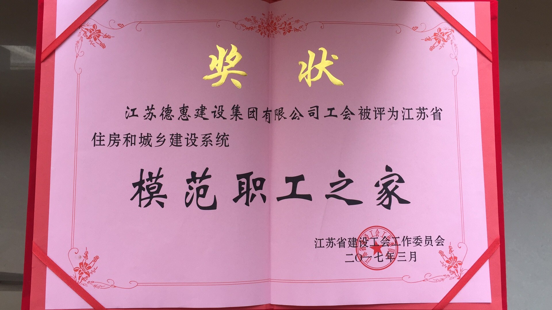 熱烈祝賀江蘇德惠建設(shè)集團(tuán)有限公司工會(huì)被評(píng)為江蘇省住房和城鄉(xiāng)建設(shè)系統(tǒng)“模范職工之家”榮譽(yù)稱號(hào)!??!
