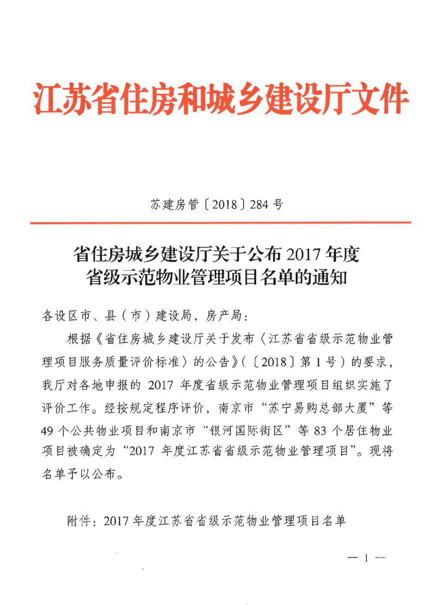 近日, 江蘇省住房和城鄉(xiāng)建設(shè)廳發(fā)布284號(hào)文公布了2017年度江蘇省省級(jí)示范物業(yè)管理項(xiàng)目名單,鹽城市阜寧縣德惠·壹品仕家榜上有名。多年來,江蘇德惠物業(yè)服務(wù)有限公司一直秉承“讓生活更舒適”的服務(wù)宗旨,從每一個(gè)細(xì)微處出發(fā),為客戶打造舒適的品質(zhì)生活。獲此殊榮,寓意著德惠物業(yè)將朝著更高的臺(tái)階邁進(jìn)! 壹品仕家小區(qū)被評(píng)為“2017度省級(jí)示范物業(yè)管理項(xiàng)目”