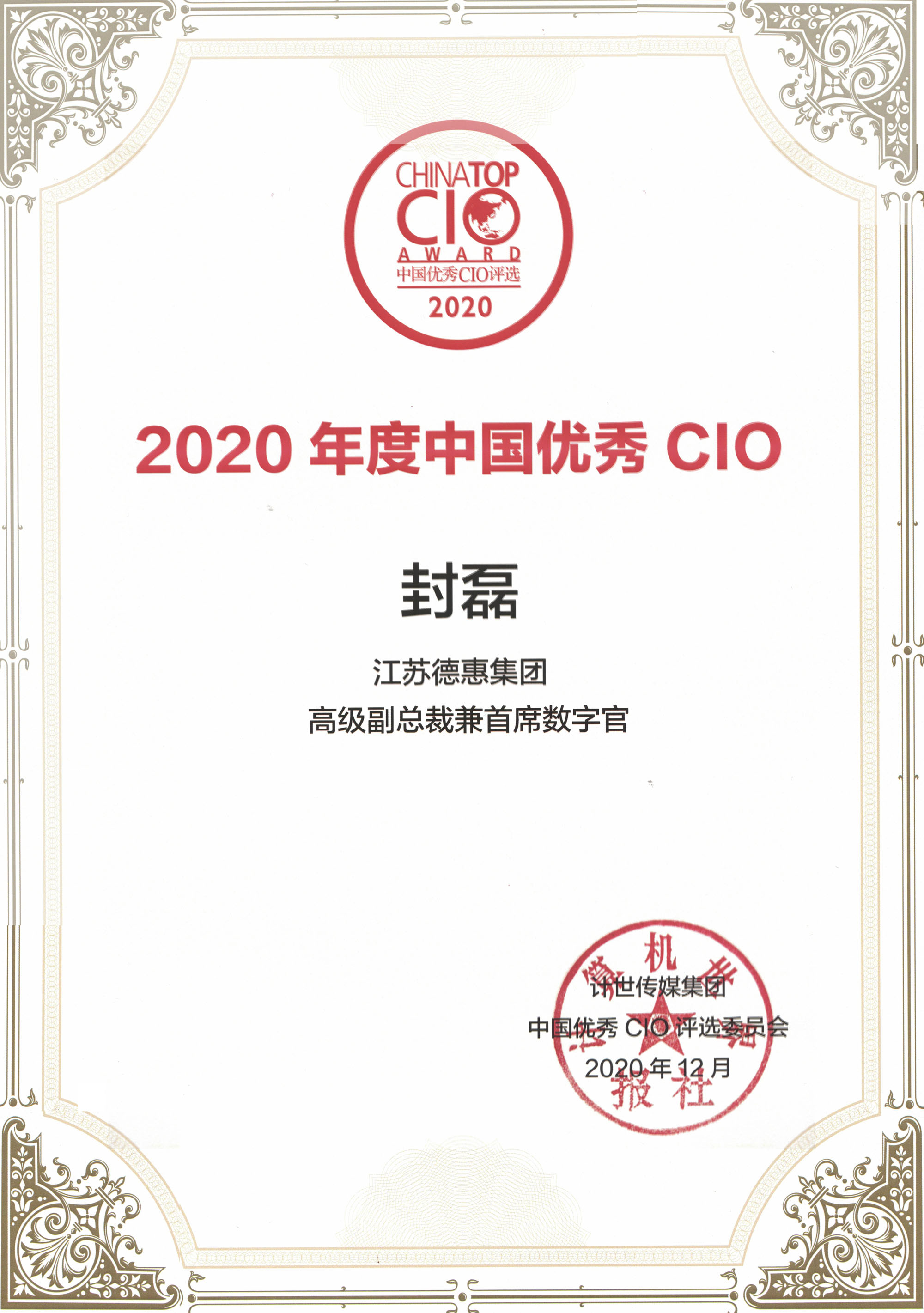 德惠集團高級副總裁兼首席數(shù)字官封磊當選“2020年度中國優(yōu)秀CIO” |