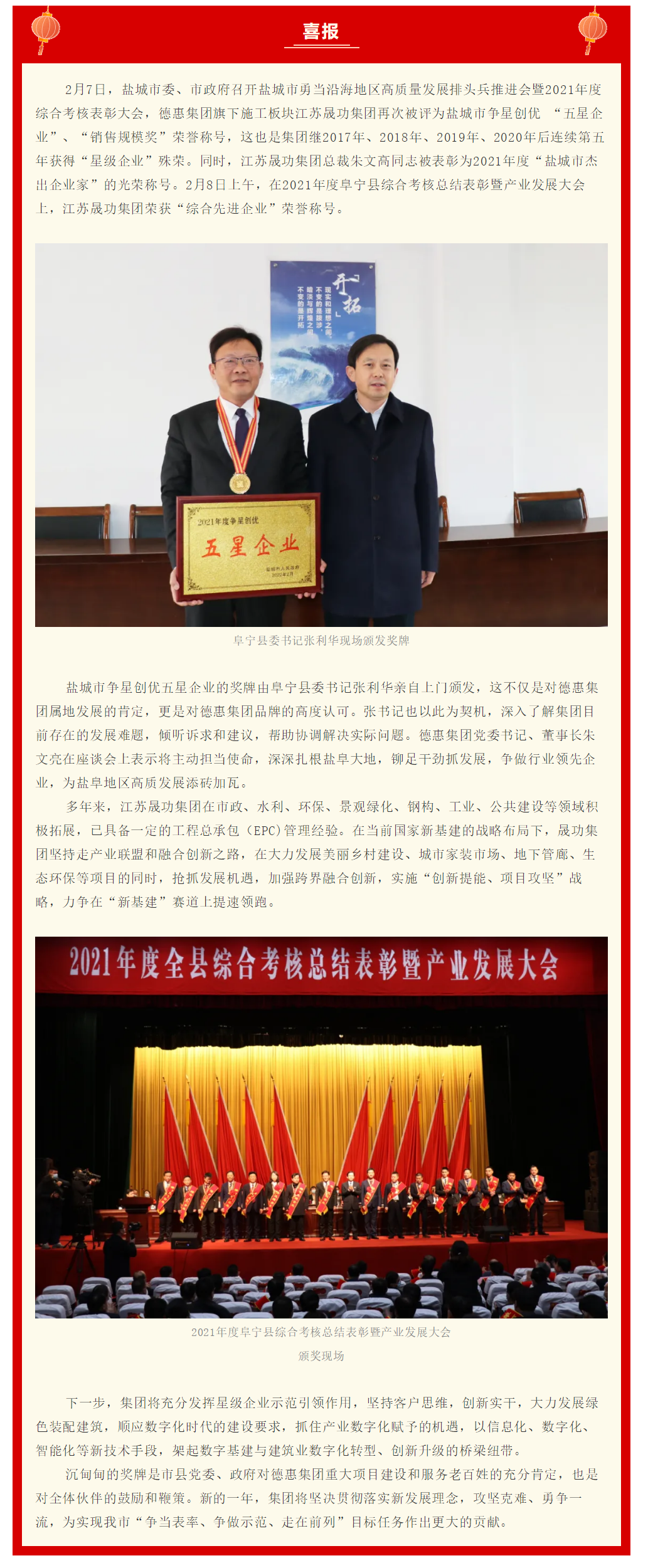 喜報(bào)頻傳!集團(tuán)蟬聯(lián)鹽城市爭(zhēng)星創(chuàng)優(yōu) “五星企業(yè)”、“銷售規(guī)模獎(jiǎng)”,阜寧縣“綜合先進(jìn)企業(yè)”榮譽(yù)稱號(hào)