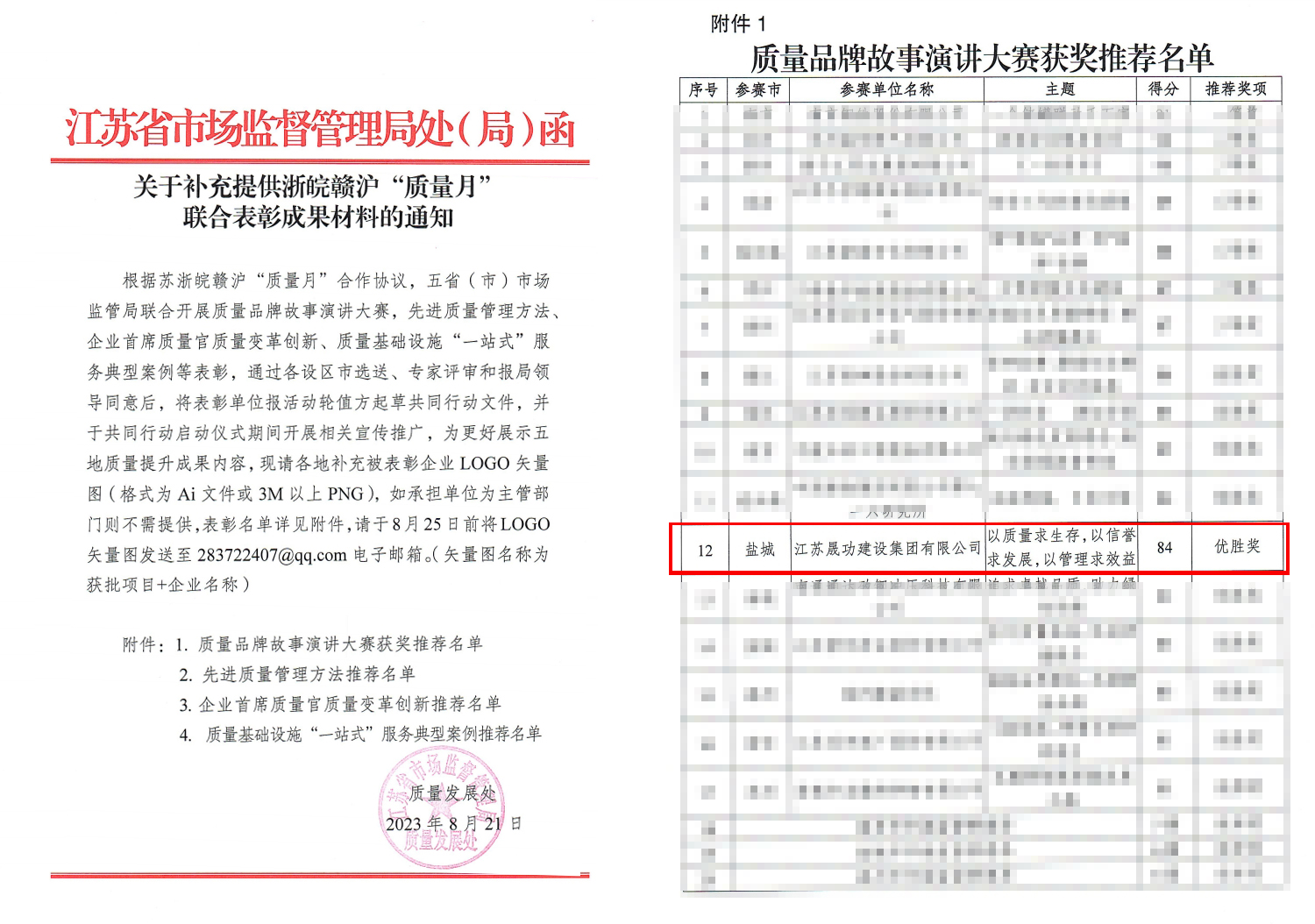 根據2023年蘇浙皖贛滬“質量月”共同行動安排,蘇浙皖贛滬四省一市市場監(jiān)督管理局決定在全國“質量月”期間聯(lián)合開展先進質量管理方法評選、質量品牌故事演講大賽視頻推薦發(fā)布活動。江蘇晟功集團憑借《以質量求生存,以信譽求發(fā)展,以管理求效益》的品牌故事大賽演講視頻,獲得2023年蘇浙皖贛滬“質量月”質量品牌故事演講大賽優(yōu)勝獎。
