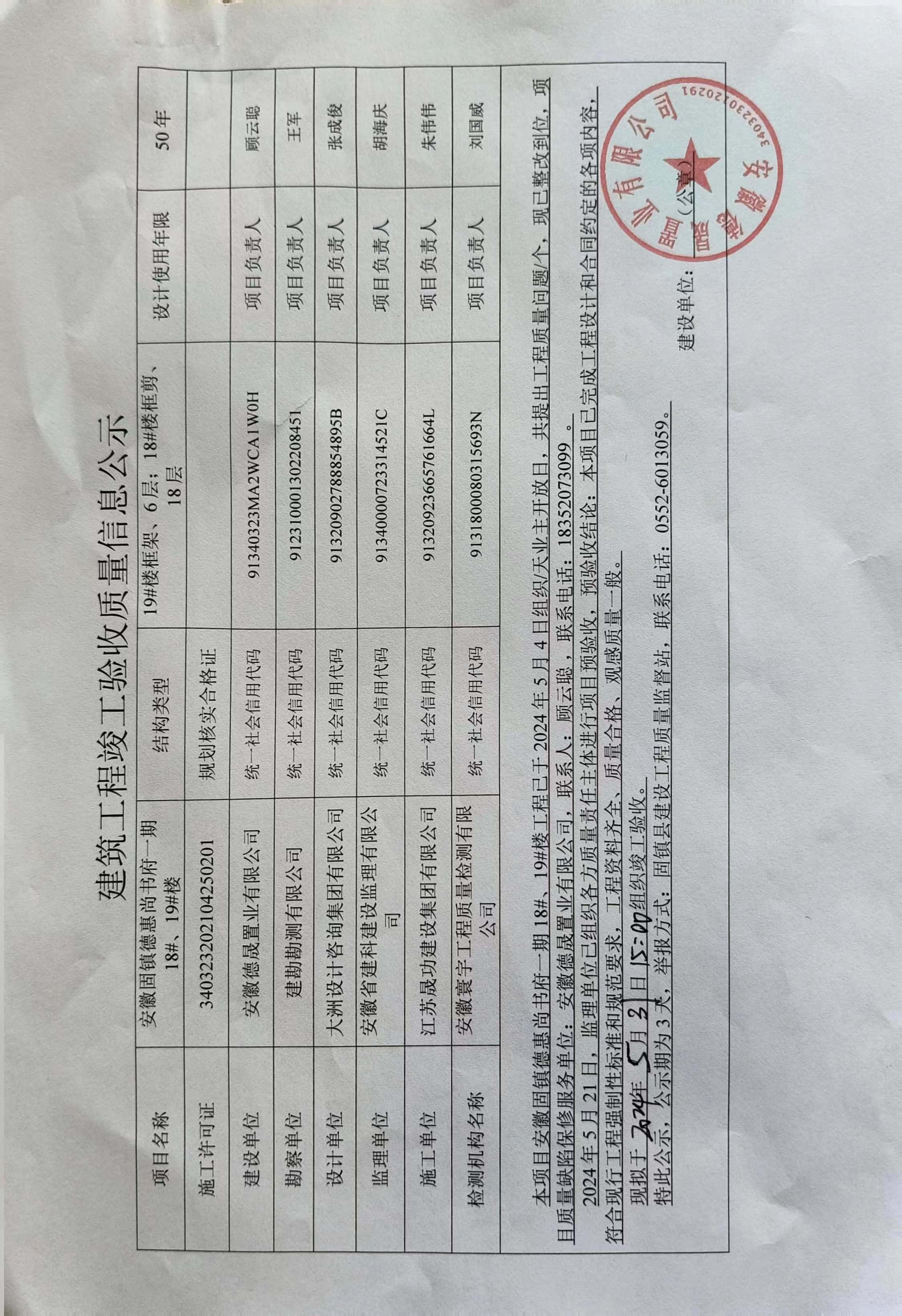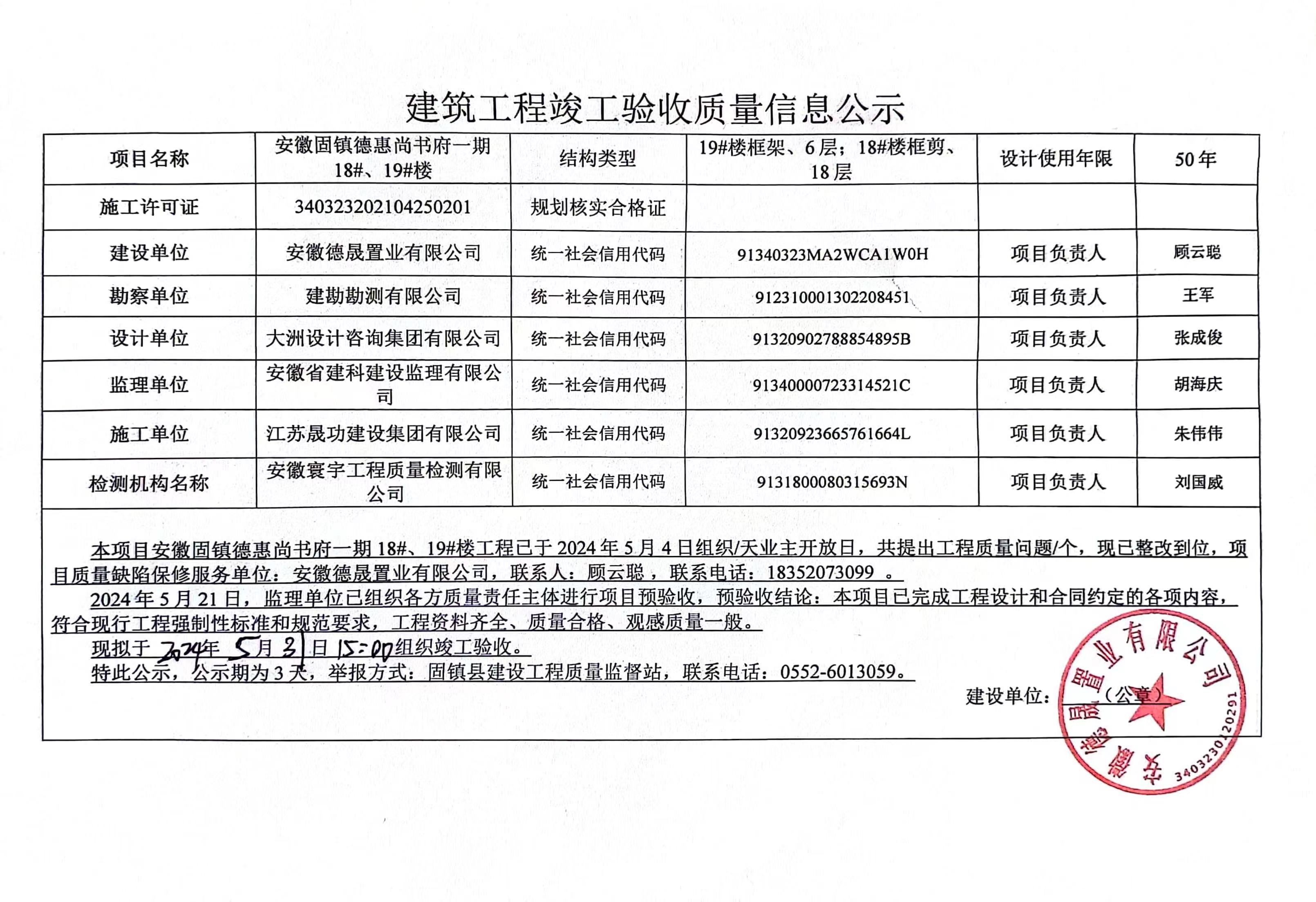 安徽固鎮(zhèn)德惠尚書府一期18#、19#樓建筑工程竣工驗收質(zhì)量信息公示