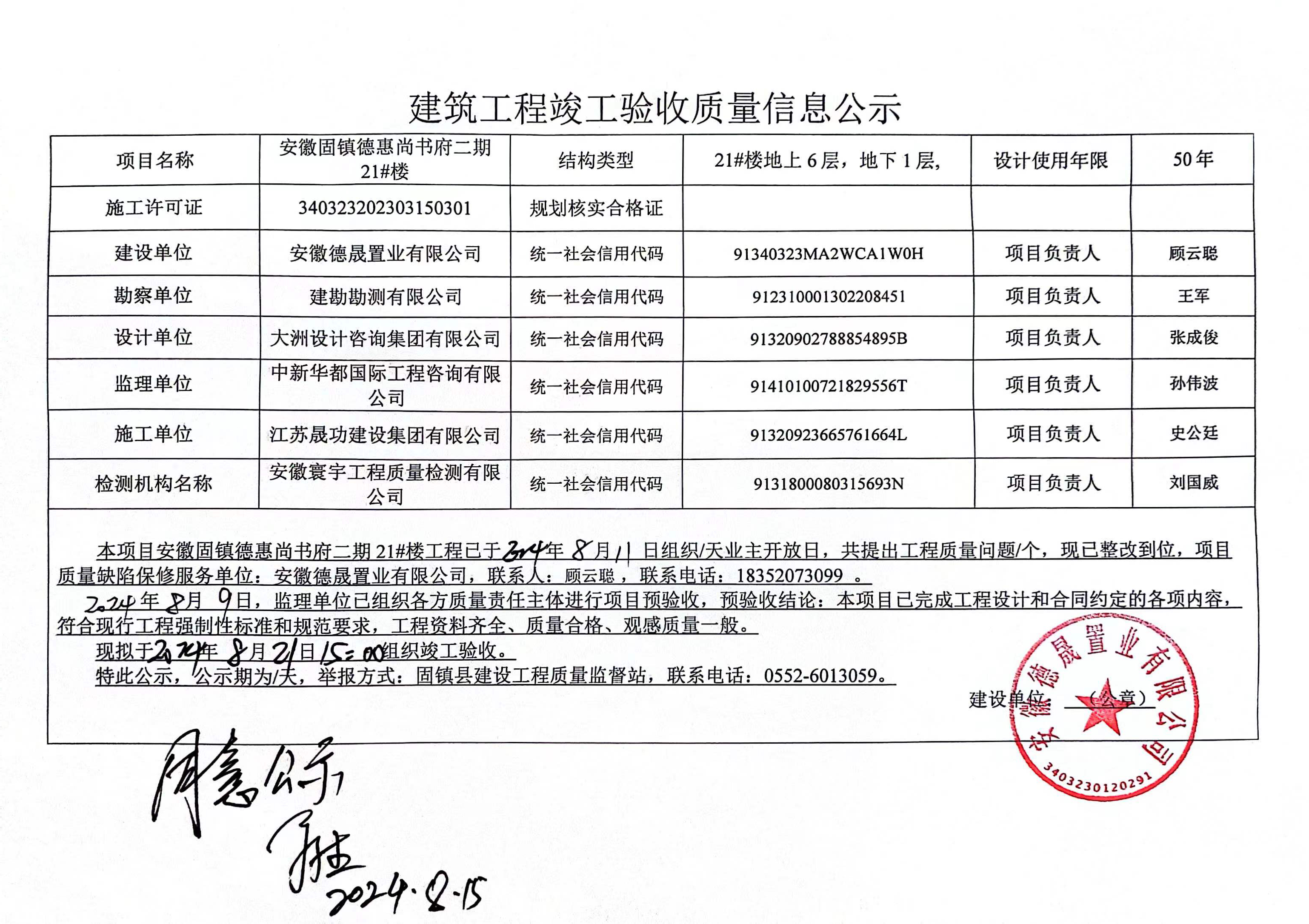 安徽固鎮(zhèn)德惠尚書府二期21#樓建筑工程竣工驗(yàn)收質(zhì)量信息公示